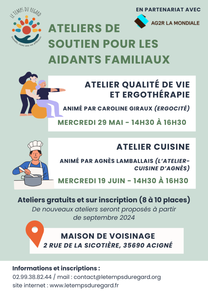 Le prochain atelier à destination des aidants est prévu mercredi 19 juin de 14h30 à 16h30 à la Maison de Voisinage. L’accent sera porté sur la rencontre et le partage autour d’un atelier cuisine animé par Agnès Lamballais.